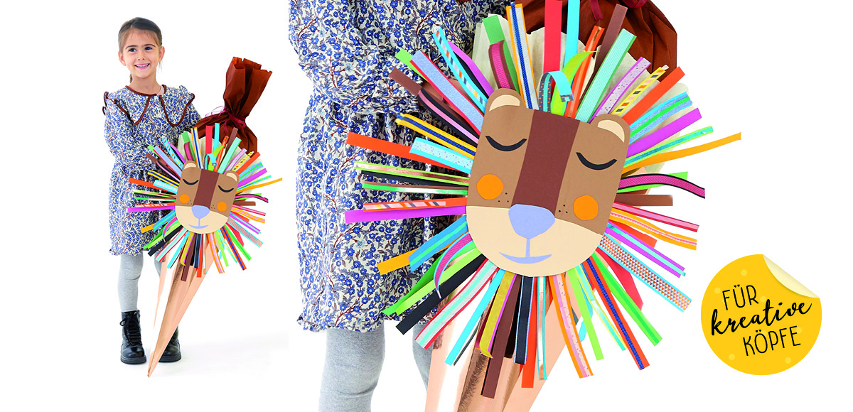 - Papierstreifen mit Klebebändern verzieren und schon erhält der Löwe seinen ganz eigenen Look.